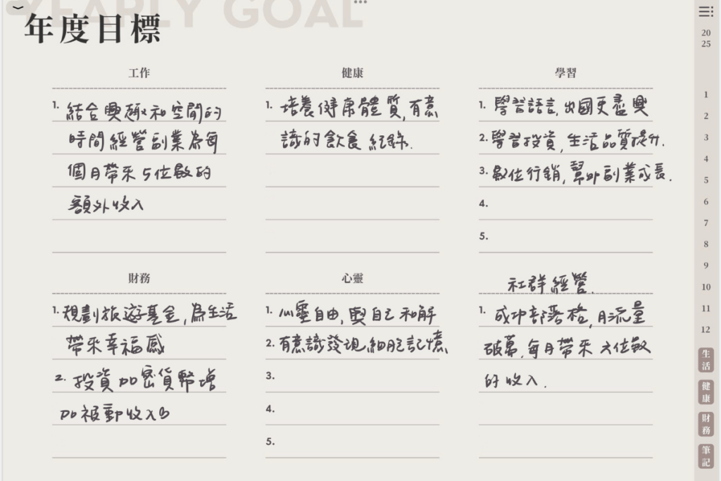 就是我今年初的2025 GoodNotes模板手帳,結合了每日的顯化日記,月計畫、週計劃、多功能的手帳 ! 健康、財務、生活、筆記 All In One 全部都在同一本,方便記錄攜帶!